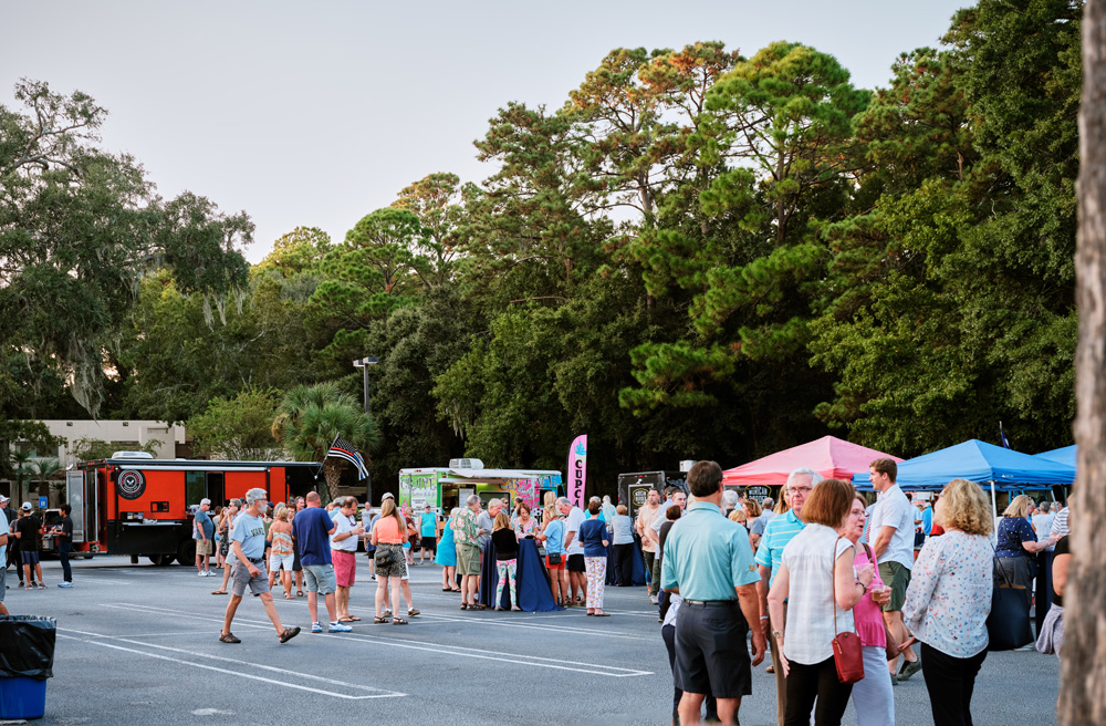Sea Pines Center hosted a Food Truck Festival on October 4, 2019. The Festival was organized by David Warren and was sponsored by RBC and The Heritage Classic Foundation. Hilton Head Heroes was the beneficiary of this event. The Heritage Foundation students and faculty volunteered to help park cars and assist with guests. Adults and children were asked to make “cards” that will be given to arriving Hero Families. Food Truck cuisine, wine, beer and the music of The Chilly Willy Band, with singer Mary Lynn Finn were some of special treats of the evening.
